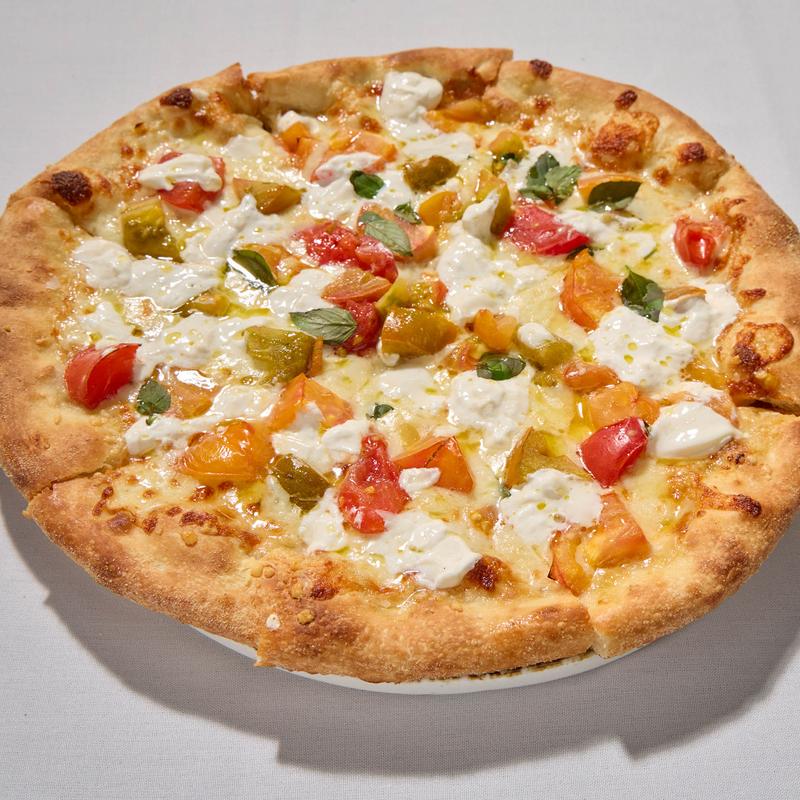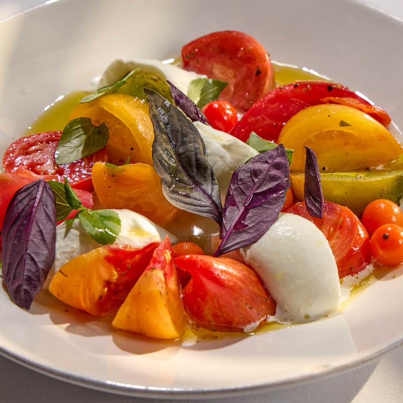 Heirloom cherry tomatoes, mozzarella, burrata, our garden's basil.