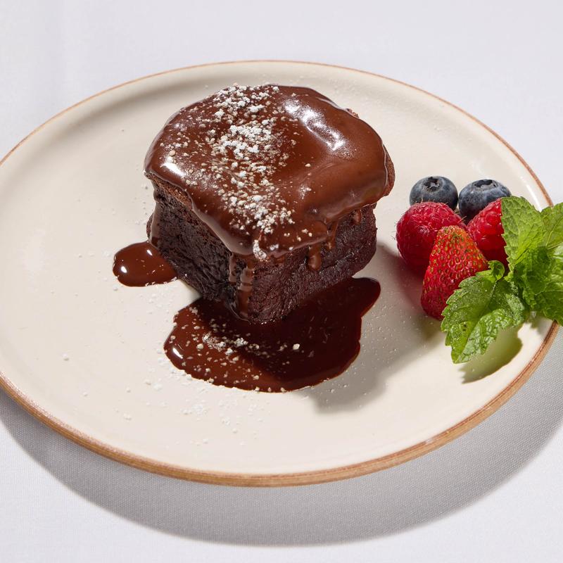 Gluten-free flourless Belgian dark chocolate cake, chocolate fudge.