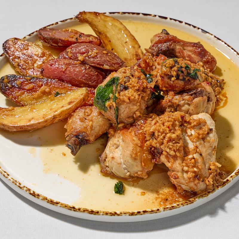Roasted chicken, garlic, chili, white wine, roasted fingerling potatoes.
