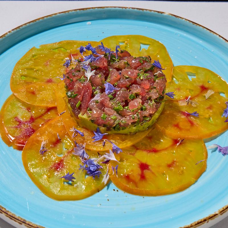 Tuna avocado, tomato carpaccio, wild Boston blue fin tuna tartar.